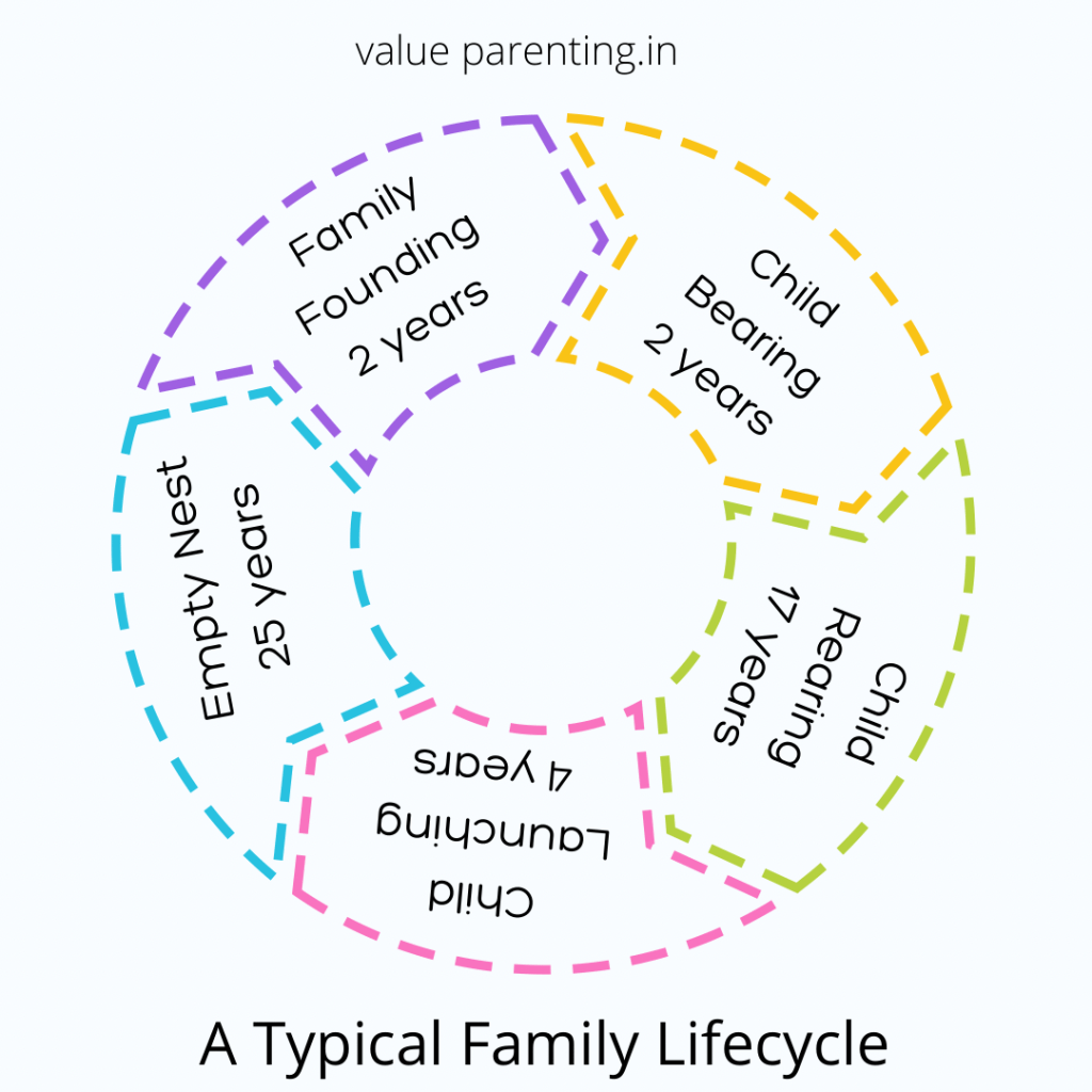 Everything that lives follows a lifecycle. I learnt recently how even our family lives trace a lifecycle. A family life cycle is the set of predictable steps and patterns families experience over time. It is a set of emotional and intellectual experiences that one has to go through in a family from childhood to old age. A typical modern family may have a lifespan of about 50 years.